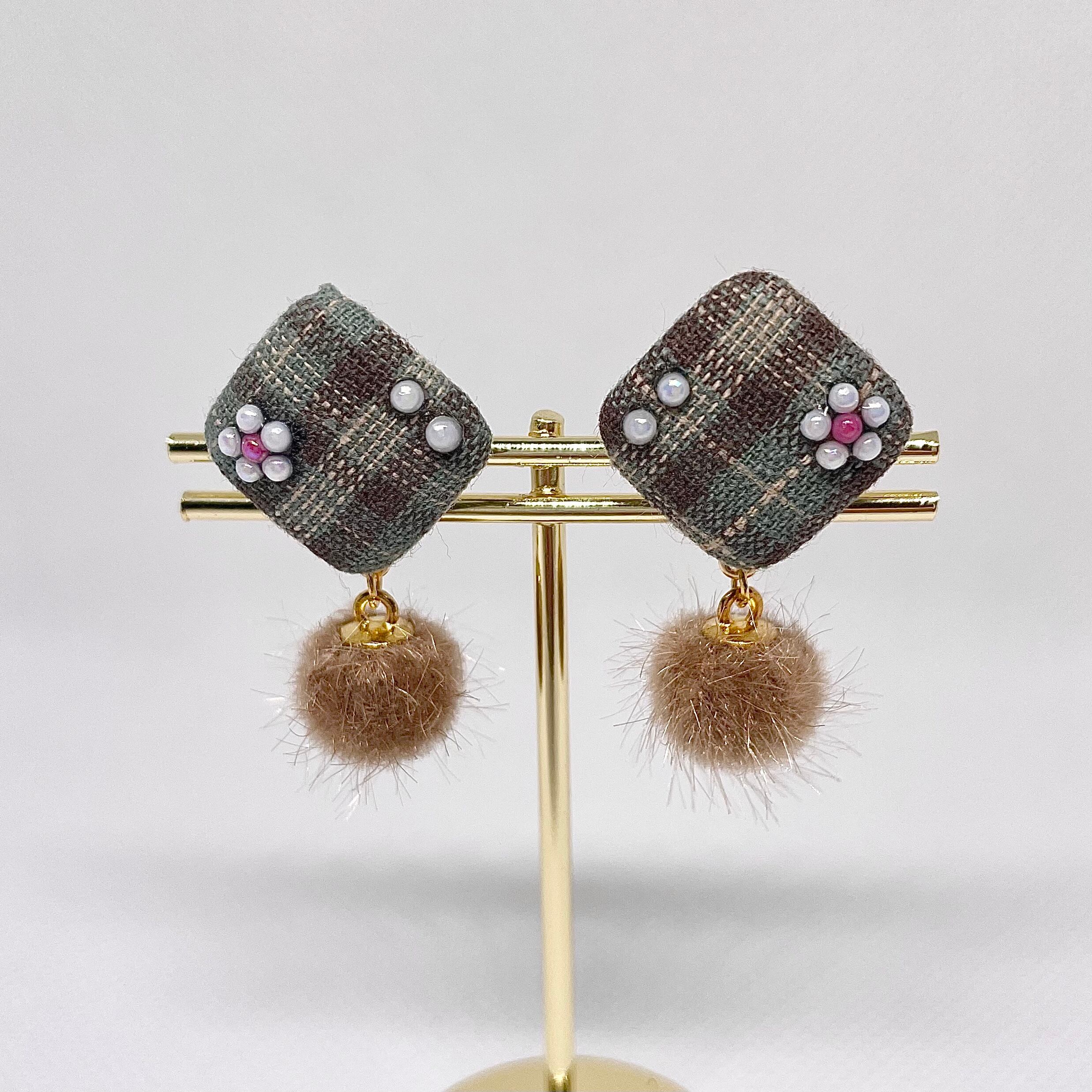冬にぴったりのふわふわのボールチャームが可愛い、チェック柄のくるみボタンを使用したお花のピアスです❁⃘