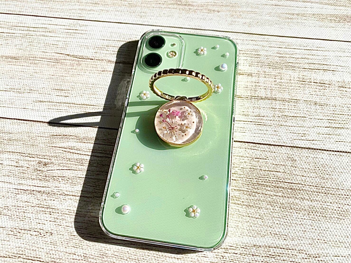 淡いピンク色の本物のかすみ草を閉じ込めたバンカーリングに、小さな白いお花が可愛い商品です。